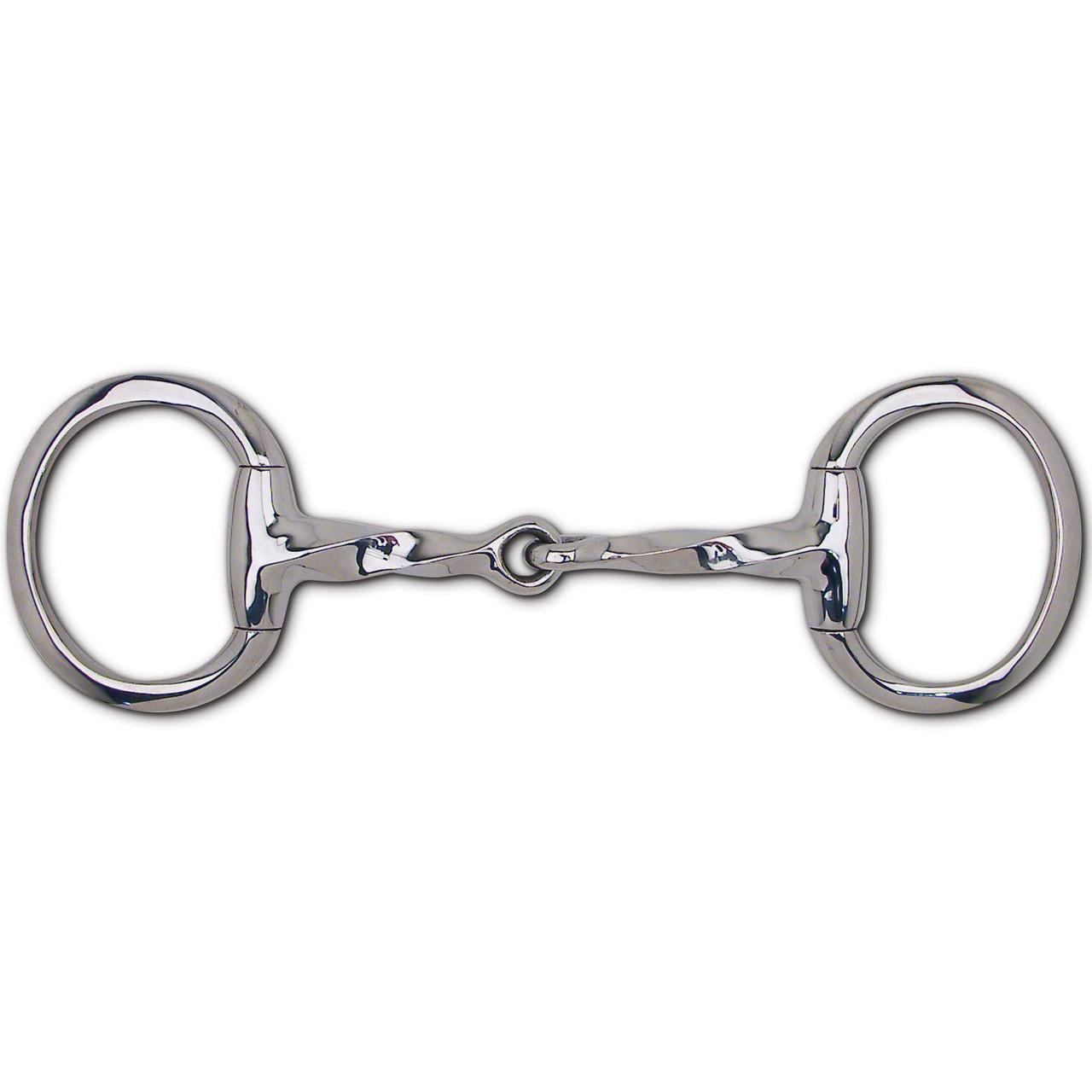 This bit has eggbutt cheeks and a slow twist, single joint mouth. The eggbutt cheeks prevent pinching, while the single joint mouth creates a slight nutcracker action. The slow twist is considered a more severe bit than a smooth mouth would be.