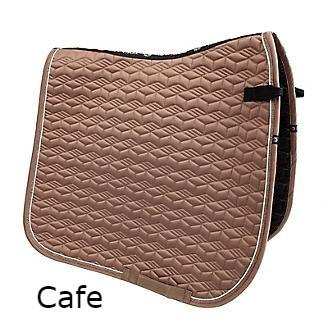 Tango Geometric Saddle Pads have a luxurious satin top with a unique geometric quilt pattern and shimmering metallic trim. These pads have soft waffle shaped wicking lining for heat and moisture management. The hook and loop straps and girth loop makes for secure fit.