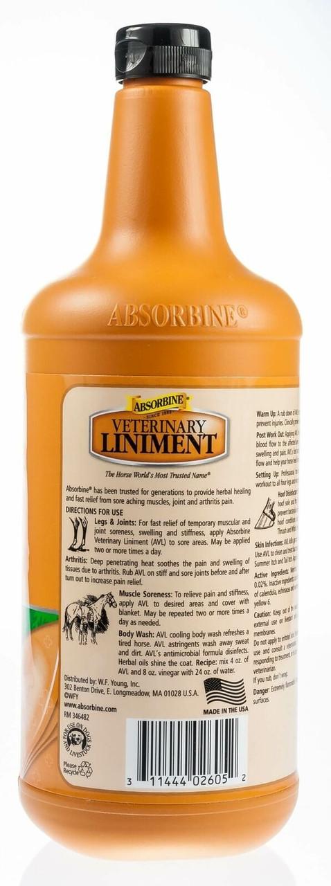 Absorbine Veterinary Liniment is a refreshing antifungal body wash aids in the relief of temporary muscular soreness, stiffness and swelling caused by exposure, overwork or exertion. Acts as a bracer and tightener. Stimulates circulation where applied. Treats superficial cuts and abrasions; helps prevent hoof and sole infections. Will not blister, stain or remove hair.