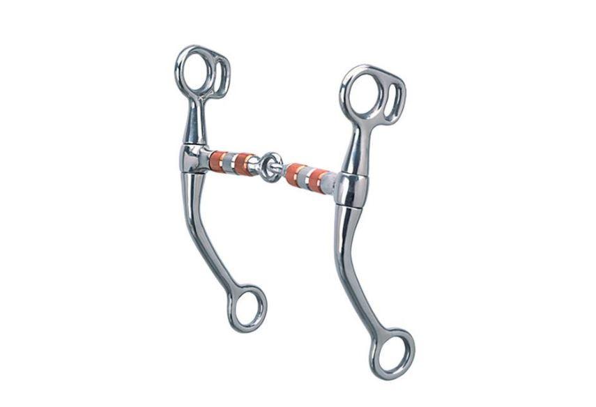 This stainless steel tom thumb snaffle bit features a 5" stainless steel and copper roller mouth and 6-1/2" cheeks.