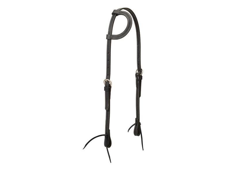 Handcrafted from single-ply 5/8" 100% natural vegetable tanned hot stuffed leather in a classic black color, this headstall features a doubled and stitched earpiece. Flat sliding ear design gives you easy positioning. Double cheek adjustments provide a perfect fit. Black leather ties at bit ends. Durable nickel plated hardware. Horse size.