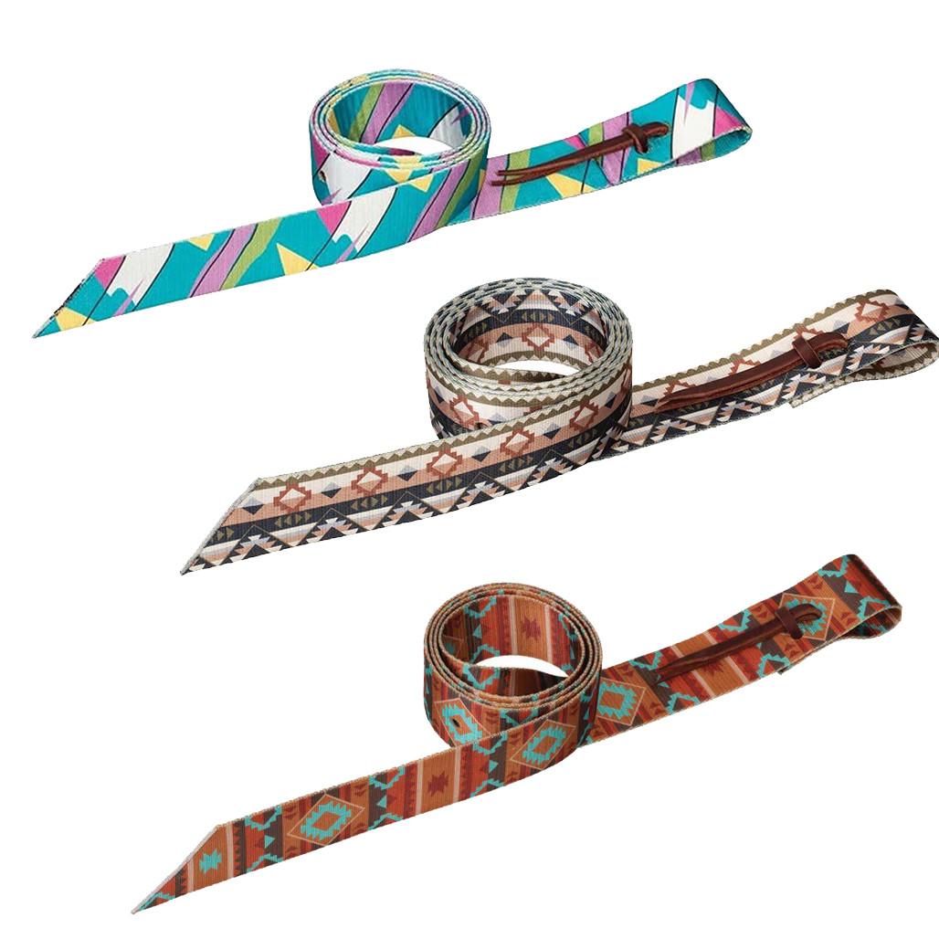 For a reliable fit when tightening your horse's cinch, choose this patterned polyester tie strap. Features holes for buckling and a burgundy alum tanned leather tie.