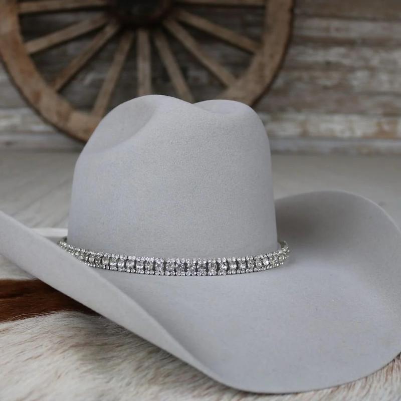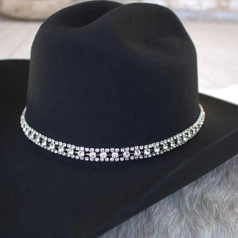 This rhinestone strand hatband comes with 3 layers of clear rhinestones set on silver metal. It is adjustable with a metal clasp in the back. Fits up to size 7 1/2 hat.