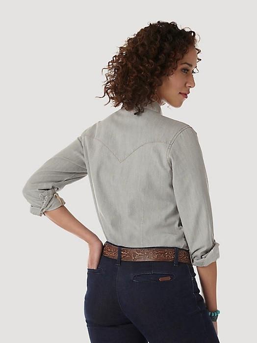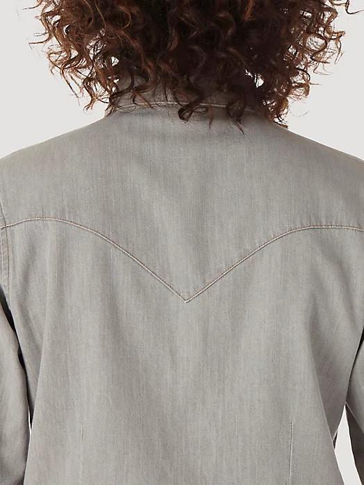 MODERN DENIM SHIRT - Experience a new take on tradition with this popular seller. Soft grey denim sets the background for front and back yokes, Western snaps and W-embroidered flap pockets. A Wrangler® Riser label adds an authentic finishing touch.