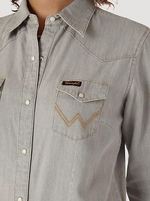 Wrangler Women's Grey Denim Western Snap W Stitching On Pocket Denim Shirt