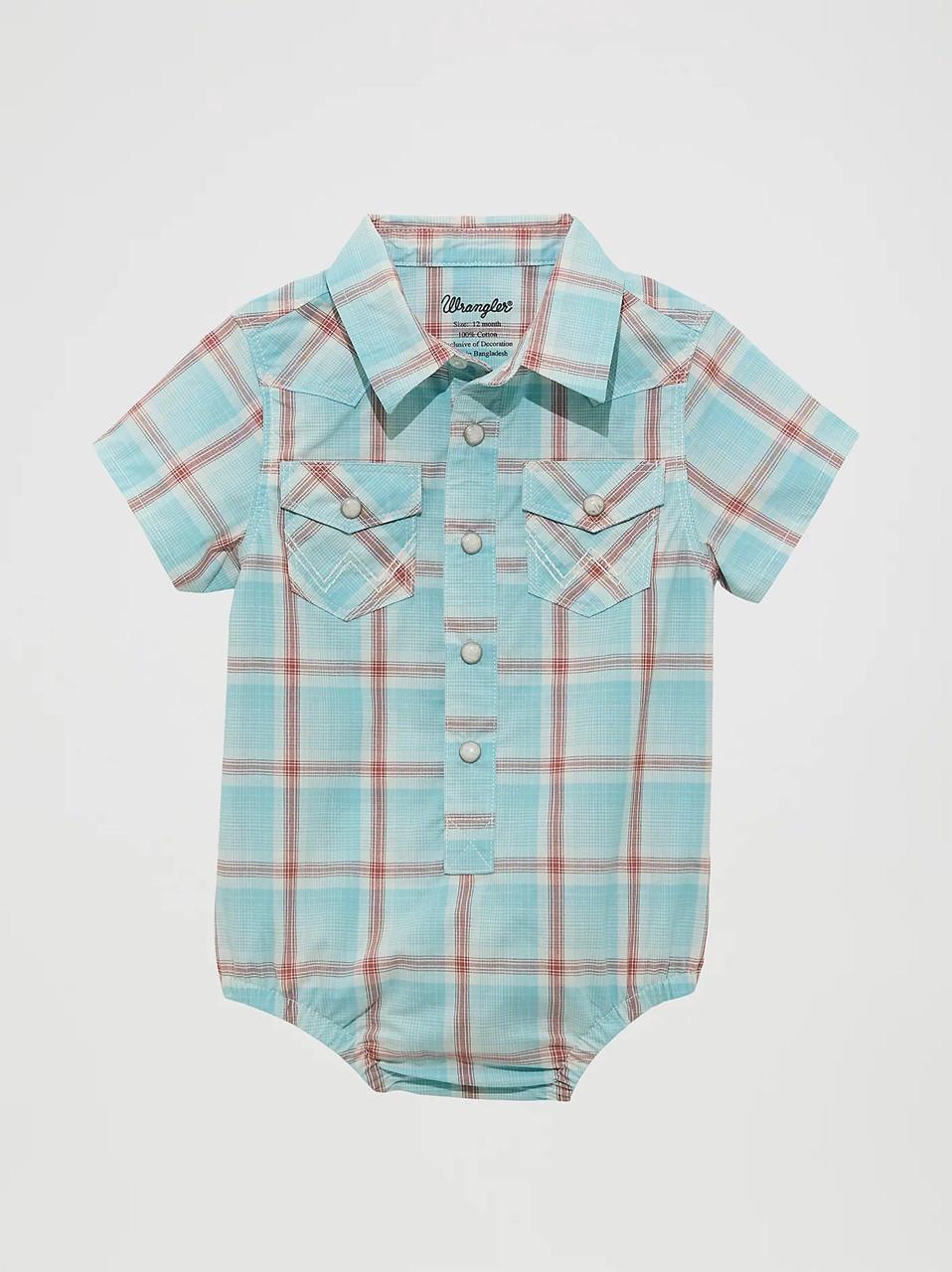 WESTERN INSPIRED ONESIE - Your miniature man is ready for playtime and beyond in this plaid bodysuit. Bias Western yokes and snap pockets with our signature W embroidery give him our trademark style, while the three snap placket and seat closure also make it incredibly easy to wear.