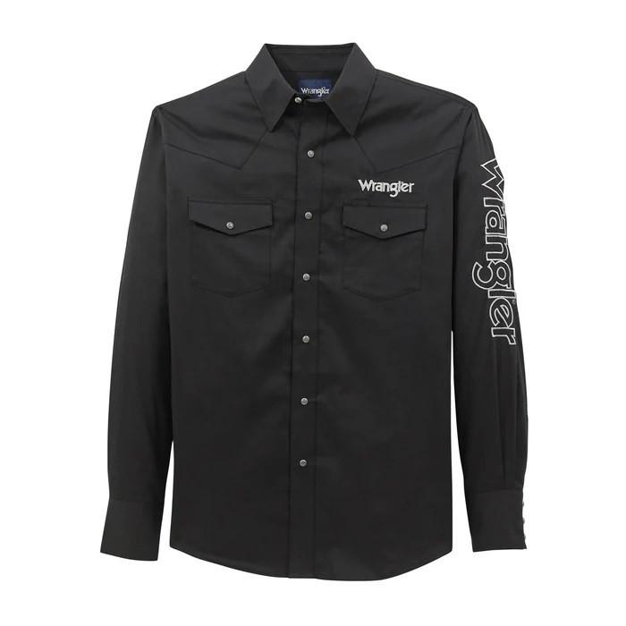 Wear the look of a champion with this distinguished logo shirt. It's crafted of soft, top-quality fabric with the Wrangler® logo embroidered boldly in several key places. A spread collar with grey pearl snaps, Western back yoke and snap flap front pockets cap off the impressive style.