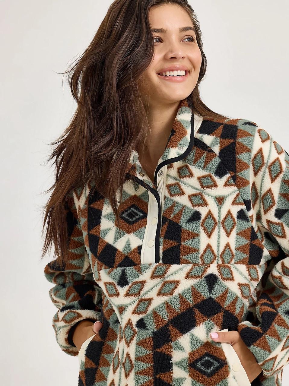 Stepping out in this weather? Not without the Women's Wrangler Retro® 1/2 Snap Sherpa Pullover to keep you cozy. This cold-weather must-have provides the comfort and warmth that only Sherpa can, complete with a Western-inspired design that’s sure to brighten up your rotation with cowgirl flair. It also features a partial snap closure, two lower pockets, contrast trim, and a looser fit you’ll love.