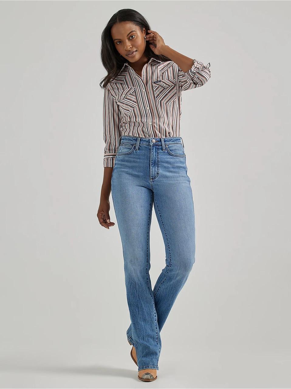 Show off your stripes with the Wrangler Retro bold stripe Western snap shirt. The snap shirt has long been a favorite of rough riding cowboys for its pearled clasps, spaded pockets, pointed front and back yokes, and close-fitting snag-preventing design. This feminine take on the classic Western design utilizes rich stripes of red and pink adorning the fabric from every angle, as rich in color as the Amarillo sunset. Made from 100% cotton twill, this long-sleeved snap shirt will keep the sun off your skin while still being breathable enough for a long day of riding.